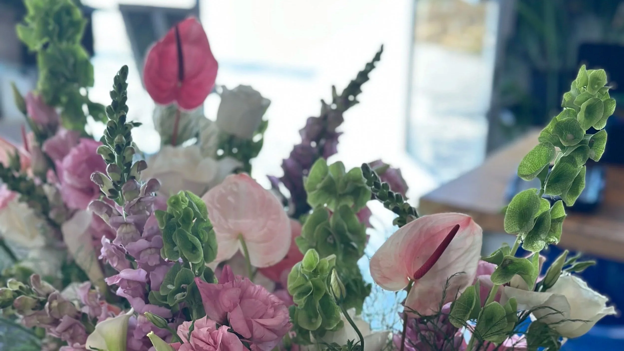 A bouquet of mixed flowers including roses, anemones, and other blossoms in pastel and deep colors.